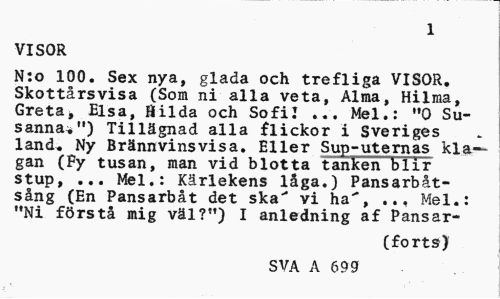 //// 1 //// VISOR //// N:o 100. Sex nya, glada och trefliga VISOR. Skottårsvisa (Som ni alla veta, Alma, Hilma, Gretaj Elsa, Bilda och Sofil ... Mel.: "0 Susanna.") Tillägnad alla flickor i Sveriges land. Ny Brännvinsvisa. Eller Sup-utemas klagan (Fy tusan, man vid blotta tanken blir stup, ... Mel.: Kärlekens låga.) Pansarbåt-sång (En Pansarbåt det ska" vi ha", ... Mel.: "Ni förstå mig väl?") I anledning af Pansar- //// (forts) //// SVA A 699 ////
