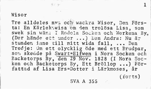 //// 1 //// Wisor //// Tre alldeles nva och- wackra Wisor, Den Första: En Kärlek*, wisa öm den trolösa Lisa, som swek sin v/än; I Rodola Socken och Werkena By, (Der hände ett under ...) Lan Andra: Nu är stunden inne till mitt wida fall, ... Den Tredje: Om ett olycklig öde med ett Brudpar, sov* skedde på Swart=Elfwen i Nora Socken och. Backetorps By, den 29 Nov. 1828 (I Nora Socken och Backetorps By, Ett Bröllop ...) Författad af Lisa Ers=Dotter i Lärkmoses, år //// (forts) //// SVA A 355 ////