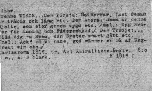 //// isor. //// renne WIöCR...Den Första; 3©dHerrar, fast resan r t råk ij? o c ti lårwr etc. Ben Andnit; awera ar denne i.: el te, som stor genom dygd «*c . /mel.; Upp Brö* !*r ter Konung och Fädeynefcygd J Den Tredje;... Jlad dig nu 3w«e, dir Syster snart gått etc. mel.: Ack i om wi hade, *$od wärner en 3å af frsict win etc./ //// Jarlskrona 1815, tr. Amiral Hets-Bcktr, 8; o a., ». 2 blank. £ l8l* f ////