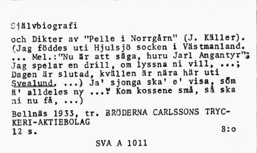 //// Självbiografi //// och Dikter av "Pelle i Norrgårn" (J. Käller). (Jag föddes uti Hjulsjö socken i Västmanland. ... Mel.:"Nu är att säga, huru Jarl Ångantyr"l Jag spelar en drill, om lyssna ni vill, .«.; Dagen är slutad, kvällen är nära här uti Svealund. ,..) Ja' sjonga ska' e' visa, söm ä' alldeles ny ...V Kom kossene små, Så ska ni nu få, ,.. j //// Bollnäs 1933, tr. BRÖDERNA CARLSSONS TRYCKERI -AKTIEBOLAG //// 12 s. 8:0 //// SVA A 1011 ////