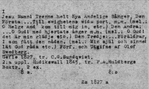 //// I ¦ . . j: ' t //// Jesu Kamni Trerine helt Nya Andel i ge Sånger Den Första;.. »T^ll ewigjietens wida port, m„m. (mel.; //// 0 Helge And' kem till mig in, etc.) Den Andra; ...0 Gud i med hjertats ånger m.ra. (mel.; 0 Gud l det är min glädje etc,) Den Tredj e; .. .Föräldrar, //// 1 sera fått den nåden, (mel.: Min själ och sinnel lät Gud råda etc.) Förf. och Utgifae af Olof Swedberg. //// TTe {Te~Tö27 , tr. C .G.Sundqwist, //// 2;a uppl. Hudikswall 1845. tr. ?.A.Huldbergs //// Boktr., 2 ex. //// 8 s. £;© //// Zz 1827 a ////