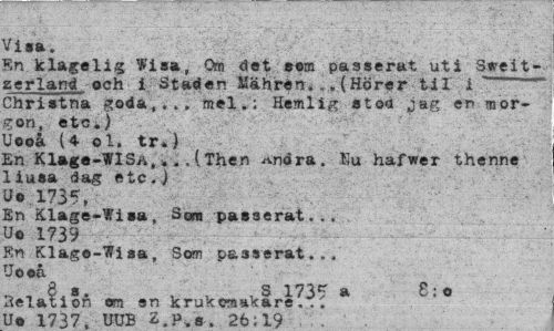 //// Visa. //// En klagelig Wisa, Om det #®m passerat uti Sweit-eerland och i Staden Siährdn... (Hörer til i —å— Christna goda,... mel.; Hemlig stod jag en morgon, etc.) Uooå (4- ol. tr.) //// En Klmge-WISA,...(Then ^ndra. Eu hafwer thenne liusa dag etc.j U© 1735, //// En Klage-Wisa, San passerat... //// Uo 1739 //// En Klago-Wiaa, Som p&3»erat... Uooå //// Relation on sn krukomakare?-?? Ä 8:0 //// U© 17^7. UUE Z.P.s. 26:19 ////