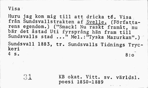 //// Visa //// Huru jag kom mig till att dricka té. Visa från Sundsvallstrakten af Svelle. (Författarens egendom.) ("Smackl Nu raskt framåt, nu bär det åstad Uti fyrsprång hän fram till Sundsvalls stad ..." Mel.:"Tyska Mazurkan".) //// Sundsvall 1883, tr. Sundsvalls Tidnings Tryckeri //// 4 s. 8:0 //// KB okat. Vitt. sv. världsl. poesi 1850-1889 ////