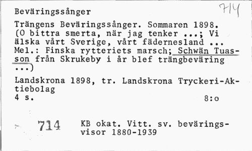 //// Beväringssånger ' ( //// Trängens Beväringssånger. Sommaren 1898. (O bittra smerta, när jag tenker .Vi älska vårt Sverige, vårt fädernesland ... Mel.: Finska rytteriets marsch; Schwän Tuas-son från Skrukeby i år blef trängbeväring //// Landskrona 1898, tr. Landskrona Tryckeri-Ak-tiebolag //// 4 s. 8:o //// 71 A KB okat. Vitt. sv. bevärings-visor 1880-1939 ////