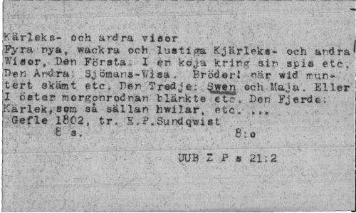 //// Kärleks- och ardra visor //// Pyra rya, wackra och lustiga Kj&rleks- och ar<dra Wisor, Den Första: I er koja kring sin spis etc. Den Andra; Sj ömans-Y/isa . Broderi när wid muntert skämt etc, Pen Tredje: jwen och Maja. Eller I Öster morgonrocfnan blänkte etc. Den Fjerde: Kärlek»som så sällan hwilar, etc. ... Gefle 1802, tr, E.P.Sundqwist //// 8 s. 8:0 //// UUB Z P s 21:2 ////