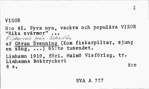 //// 2 //// VISOR //// N:o 85. Fyra nya, vackra och populära VISOR "Rika svärmor" ... //// af Göran Svenning (Kom fiskarpiltar, sjung en säng, .. .T 65:te tusendet. //// Limhamn 1910, förl. Malmö Visförlag, tr. Limhamns Boktryckeri //// 8 s. 8:o //// SVA A 7 77 ////