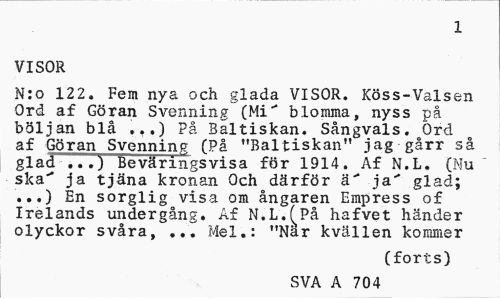 //// 1 //// VISOR //// N:o 122. Fem nya och glada VISOR. Köss-Valsen Ord af Göran Svenning (Mi" blomma, nyss på böljan blå ...) På Baltiskan. Sångvals. Ord af Göran Svenning (På "Baltiskan" jag gårr så glad ...) Beväringsvisa för 1914. Af N.L. (Nu ska" ja tjäna kronan Och därför ä" ja" glad; ...) En sorglig visa om ångaren Empress of Irelands undergång. Af N.L.^På hafvet händer olyckor svåra, ... Mel.: "När kvällen kommer //// (forts) //// SVA A 704 ////