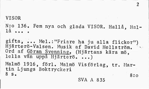 //// 2 //// VISOR //// N:o 136. Fem nya och glada VISOR. Hallå, Hal-la ... . //// gifta, ... Mel.:"Friare ha ju alla flickor") Hjärterö-Valsen. Musik af David Hellström. ' Ord af Göran Svenning. (Hjärtans kära mö, lella vän uppå Hjärterö. ...) //// Malmö 1916, förl. Malmö Visförlag, tr. Martin Ljungs Boktryckeri //// 8 s. 8:o //// SVA A 8 35 ////