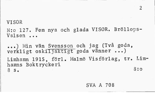 //// 2 //// VISOR //// N:o 127. Fem nya och glada VISOR. Bröllops-Valsen ... //// ...) Min vän Svensson och jag (Två goda, verkligt oskiljaktigt goda vänner ...) //// Limhamn 1915, förl. Malmö Visförlag, tr. Limhamns Boktryckeri //// 8 s. 8:o //// SVA A 708 ////
