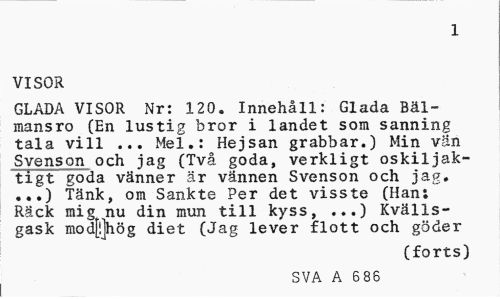 //// 1 //// VISOR //// GLADA VISOR Nr: 120. Innehåll: Glada Bäl-mansro (En lustig bror i landet som sanning tala vill ... Mel.: Hejsan grabbar.) Min vän Svenson och jag (Två goda, verkligt oskiljaktigt goda vänner är vännen Svenson och jag. ...) Tänk, om Sankte Per det visste (Han: Räck mig nu din mun till kyss, ...) Kvälls-gask mod[!]hög diet (Jag lever flott och göder //// (forts) //// SVA A 686 ////