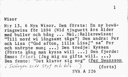 //// 1 //// Wisor //// N:r 13. 6 Nya Wisor. Den första: En ny bewä-ringswisa för 1894 (Wid tjuguett års ålder med buller och bång ... Mel.:Rallarewisan: "Till nord wi långsamt tåga") Den andra: Per och Lisa ("God afton, lilla Lisa,'" sa' Per och snörpte mun; ...) Den tredje: Kyssen (Första gång man kyssa will ...) Den fjerde: Emmas frieri (Jag mig nu gifta will. ...) Den femte: "Det klarar sig nog" ("Per Swensson t, SocetH^c-t saJ-J- Ziyf cch hc'z . (forts) //// SVA A 2 26 ////