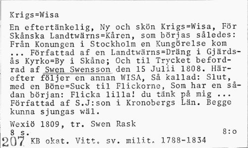 //// Krigs=Wisa //// En eftertänkelig, Ny och skön Krigs=Wisa, För Skånska Landtwärns=Kåren, som börjas således: Från Konungen i Stockholm en Kungörelse kom ... Författad af en Landtwärns=Dräng i Gjärds-ås Kyrko=By i Skåne; Och til Trycket befordrad af Swen Swensson den 15 Julii 1808. Härefter följer en annan WISA, Så kallad: Slut, med en Böne=Suck til Flicköras, Som har en sådan början: Flicka lilla! du tänk på mig ... Författad af S.J:son i Kronobergs Län. Begge kunna sjungas wäl. //// Wexiö 1809, tr. Swen Rask //// 8 s. 8: o //// 207 KB okat. Vitt. sv. milit. 1788-1834 ////