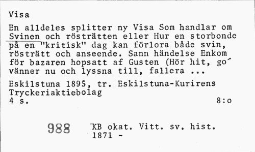 //// Visa //// En alldeles splitter ny Visa Som handlar om Svinen och rösträtten eller Hur en storbonde på en "kritisk" dag kan förlora både svin, rösträtt och anseende, Sann händelse Enkom för bazaren hopsatt af Gusten (Hör hit, go"* vänner nu och lyssna till, fallera ... //// Eskilstuna 1895, tr. Eskilstuna-Kurirens Tryckeriaktiebolag //// 4 s. 8:0 //// Q&Q KB okat. Vitt. sv. hist. 1871 - ////
