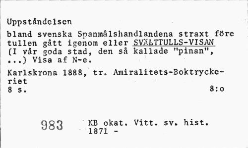 //// Uppståndelsen //// bland svenska Snanmålshandlandena straxt före tullen gått igenom eller SVÄLTTULLS-VISAN (I vår goda stad, den så kallade "pinan", .,.) Visa af N-e. //// Karlskrona 1888, tr. Amiralitets-Boktryckeriet //// 8 s. 8:0 //// QQO KB okat. Vitt. sv. hist. 1871 - ////
