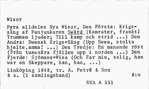 //// Wisor //// Fyra alldeles Nya Wisor, Den Första: Krigssång af Fanjunkaren Swärd_(Kamrater, framåt! Trumman ljuder; Till kamp och strid ...) Den Andra: Swensk Krigs=Sång (Upp Swea, stolta hjelte ,amma.f ...) Den Tredje: En manande röst (Från tusenåra fjällen upp i norden .,.) Den Fjerde: Sjömans=Wisa (Och Far min, salig, han war en Skeppare, han, han, ...) //// Linköping 1848, tr. A. Petré & Son 8 s. (i samlingsband) 8:0 //// SVA A 551 ////