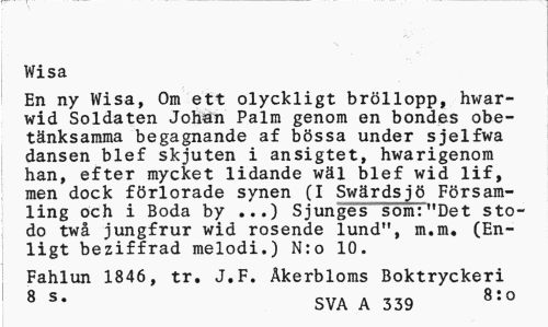 //// Wisa //// En ny Wisa, Om ett olyckligt bröllopp, hwar-wid Soldaten Johan Palm genom en bondes obetänksamma begagnande af bössa under sjelfwa dansen blef skjuten i ansigtet, hwarigenom han, efter mycket lidande wäl blef wid lif, men dock förlorade synen (I Swärdsjö Församling och i Boda by ...) Sjunges som:'*Det sto-do twå jungfrur wid rosende lund", m.nu (Enligt beziffrad melodi.) N:o 10. //// Fahlun 1846, tr, J.F. Åkerbloms Boktryckeri //// 8 s* SVA A 339 8:0 ////