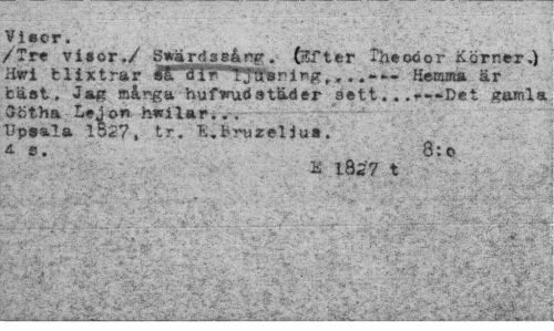 //// Viecr. //// /Tre visor./ Swärdssårw. (Efter The oo or K.örner.) //// Hsri blixtrar *g"Tfr Tyfifeniwg,,, Hemma är //// bäst. J&fr många hufvudstäder sett... *-<*Det gamla //// Sötba Lejon hwilar... //// Up**la 1327, tr. T^Bryzeliu». //// A S. 8:0 //// IS 1827 t //// I i" ; ////
