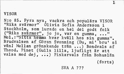 //// VISOR //// N:o 85. Fyra nya, vackra och populära VISOR "Rika svärmor" Olivia Sofia Andersson i Stockholm, som lurade en hel del godt folk ("Rika svärmor", jo jo, var en gumma, ..." Mel.:"Sitta hemma hvar kväll hos sin gumma". Brudvalsen af Göran Svenning (Du, mi' bru' så vänj Mellan grönskande trän ...) Bondvals af Theod. Pinet (Gulla lilla, ljufligt är att valsa med dej, ...) Fiskarvals från Bohuslän //// (forts) //// SVA A 7 77 ////