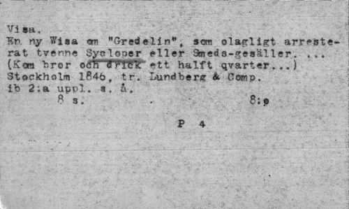 //// Vi»», //// En. ny Wisa om "Gredelin", som olagligt arresterat tvenne Syelooer eller Sned s-gesäller. ... (Ken bror ©(STTTWr ett hälft qvarter...) Stockholm 184b, tr. Lundberg & Comp. ib 2;a uppl. a. å. //// 8 s. - 8;js //// P 4 ////