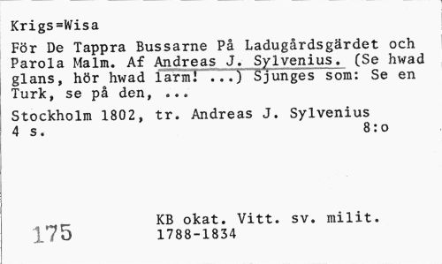 //// Krigs=Wisa //// För De Tappra Bussarne På Ladugårdsgärdet och Parola Malm. Af Andreas J. Sylvenius._ (Se hwad glans, hör hwad larmf ...) Sjunges som: Se en Turk, se på den, ... //// Stockholm 1802, tr. Andreas J. Sylvenius 4 s. 8:0 //// _ KB okat. Vitt. sv. milit. //// 175 1788-1834 ////