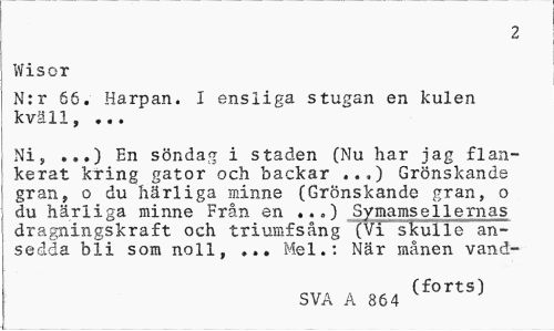 //// 2 //// Wisor //// N:r 66. Harpan. I ensliga stugan en kulen kväll, ... //// Ni, ...) En söndag i staden (Nu har jag flankerat kring gator och backar ..,) Grönskande gran, o du härliga minne (Grönskande gran, o du härliga minne Från en ..„) Symamsellernas dragningskraft och triumfsang (Vi skulle ansedda bli som noll, ... Mel.: När månen vand- //// (forts) //// SVA A 864 ////