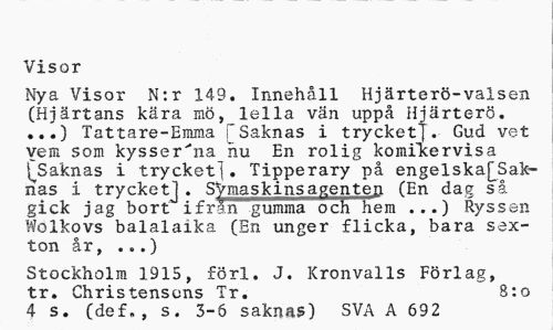 //// Visor //// Nya Visor N:r 149. Innehåll Hjärterö-valsen (Hjärtans kära mö, lella vän uppå Hjärterö. ...) Tattare-Emma "Saknas i trycketJ. Gud vet vem som kysser^na hu En rolig komikervisa ^Saknas i trycket]. Tipperary på engelska[Sak-nas i trycketj. Symaskinsagenten (En dag så gick jag bort ifrån gumma och hem ...) Ryssen Wolkovs balalaika (En unger flicka, bara sexton år, ...) //// Stockholm 1915, förl. J. Kronvalls Förlag, tr. Christensons Tr. 8:0 //// 4 s. (def„, s. 3-6 saknas) SVA A 692 ////