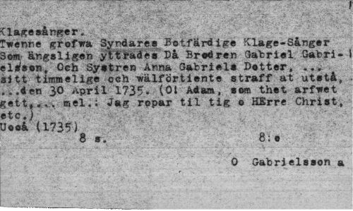 //// Syrdarea Botfarfifre Klage-Sång.r //// ÄgJuU yltl*4«» MMm D.tter //// sitsen Och Systren Anna Gabriel* Petter, //// sitt timmeli^ och wälförtiente straff at utstå, //// ...I en 30 April 1735- (01 A4am, som thet arf*et iiJ-L; mel.; Jag ropar til tig o HErre Chnst, etc.) //// Je.4 (1735), g:, //// 0 Gabrielsson a //// . ... ////