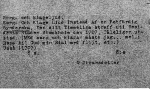 //// 3? T " • » - - .v, ' ' //// ; .. '(Sg^ v; , //// Sorg- och klagoljud» //// Och Kl agn» Liud Inst«md Af er» Botfärdig Synderska, Den sitt T inne.lie» straff uti R«si-dTnfr^^öen St«ckholm den 170?, Tåleliger ut-, s t ed . (MEd eersr och klagar måste jas... mel. j Ber-» til Gud min Siäl med flijt, etc.) Ueeå (1707) //// • 0 Jöransdotter . //// : ¦ : m ////