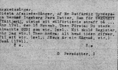 //// wskedssånger. //// Sidsta Af »k i ed a-sånger, Af En Botfärdig Synders-:a Benäad Ingeborg Pers Dotter, Som för FggaBlfTt ^ättjerij, utstod sit walförtiente straff nå ... Ihr 1741. den 18 Hovemb. Then Första; Du store ilmackts GUD1 som etc. (mel.. Mit skuld Register, lär jag etc.) Then Andra: Alt hwad tiden gifwer, ?il sit etc. (mel.; JEsus är min Hägnad, et-.) Jooå (1741). //// 8 s. . 8:o //// 0 Persdotter, I ////