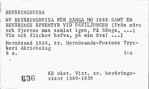 //// BEVÄRINGSVISA //// NY BEVÄRINGSVISA FÖR SÅNGA MO 1888 SAMT EN BEVÄRINGS ÄFVENTYR VID PAVILJONGEN (Från nära och fjerran man samlat igen. På Sånga, .. Vin och flickor hafva, på min äral ..,) //// Hernösand 1888, tr. Hernösands-Postens Tryckeri Aktiebolag //// 8 s. 3:o //// KB okat. Vitt. sv. bevärings-£36 visor 1880-1939 ////