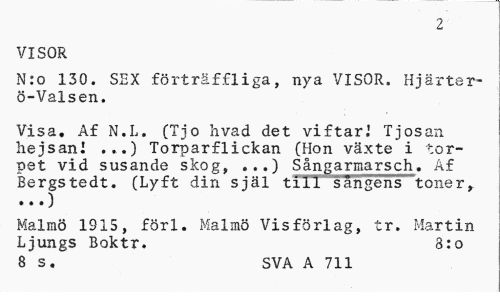 //// 2 //// VISOR //// N:o 130. SEX förträffliga, nya VISOR. Hjärter-ö-Valsen. //// Visa. Af N.L. (T j-o hvad det viftar.' Tjosan hejsan! ...) Torparflickan (Hon växte i torpet vid susande skog, ...) Sångarmarsch. Af Bergstedt. (Lyft din själ till sångens toner, //// Malmö 1915, förl. Malmö Visförlag, tr. Martin Ljungs Boktr. 3:o //// 8 s. SVA A 711 ////