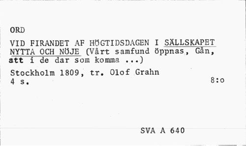 //// ORD //// VID FIRANDET AF HÖGTIDSDAGEN I SÄLLSKAPET NYTTA OCH NÖJE (Vårt samfund öppnas, Gån, att i de dar som komma ...) //// Stockholm 1809, tr. Olof Grahn 4 s. 8:0 //// SVA A 640 ////