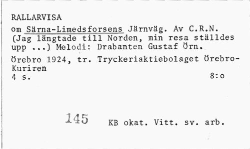 //// RALLARVISA //// om Särna-Limedsforsens -Järnväg. Av C.R.N. (Jag längtade till Norden, min resa ställdes upp ...) Melodi: Drabanten Gustaf örn. //// Örebro 1924, tr. Tryckeriaktiebolaget örebro-Kuriren //// 4 s. 8:0 //// 7 /T tr //// kb okat. Vitt. sv. arb. ////