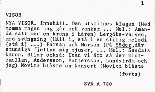 //// X //// VISOR //// NYA VISOR. Innehåll. Den utslitnes klagan (Med tomma magen jag går och vankar,... Mel.: Amanda satt med en krans i håren) Lergöks-valsen, medsvängning (Håll i, stå i en stilig melodi (stå i) ...) Farsan och Morsan (På Söder.där stunsiga fjellan mig tjusar, ... Mel.: Sandals kanon. Eller också: Utan vi äro så der midt-emellan, Andersson, Pettersson, Lundström och jag) Movitz blåste en konsert (Movitz blåste //// (forts) //// SVA A 780 ////