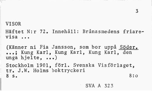 //// 3 //// VISOR //// Häftet N:r 72. Innehåll: Brånasmedens friare-visa ... //// (Känner ni Fia Jansson, som bor uppå Söder. ...; Kung Karl, Kung Karl, Kung Karl, den unga hjelte, ...) //// Stockholm 1901, förl. Svenska Visförlaget, tr. J,W. Holms boktryckeri 8 s. 8:o //// SVA A 32 3 ////