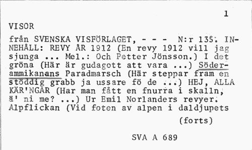 //// 1 //// VISOR //// från SVENSKA VISFÖRLAGET, --- N:r 135; INNEHÅLL: REVY ÅR 1912 (En revy 1912 vill jag sjunga ... Mel.: Och Petter Jönsson.) I det gröna (Här är gudagott att vara ..,) Söder-ammikanans Paradmarsch (Här steppar fram en stöddig grabb ja ussare fö de ...) HEJ, ALLA KÄR'NGAR (Har man fått en fnurra i skalln, ä1 ni me? ...) Ur Emil Norlanders revyer. Alpflickan (Vid foten av alpen i daldjupets //// (forts) //// SVA A 689 ////