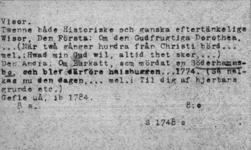 //// Viaor. //// T*enne både Historiske och ganska eftertänkelige Wisor, Den Företa: Om den Saft-fru* tiga Derothea, .».(När twå »rånfrer hundra från Christi börd ,., ««t.;HwM min Cr#d wil, altid thet sker,...) Den Anäi a; Om llUrkatt, s cm mördat en 3öd erhaang» bg^ och btef «&rf»re n»iahu«*en.. .1774T~T5irW«T-k» a nu i en ftagen„.,. mel. i Til d i/? af hjertara grunde etc,) Gefle uå, ib 1784-. . B b... 8: • .. //// S 174.8 * ¦ ////