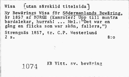 //// Wisa | utan särskild titelsida^] //// Ny Bewärings Wisa för Södermanlands Bewäring.. år 185 7 af BÖRGE (Kamrater.' Upp till muntra bardalekar, hurrahl ... Mel.:"Det v/ar en gång en flicka som v/ar skön, fallera,") //// Strengnäs 1857, tr. CaP. Westerlund 2 s. 8:o //// H 07 ^ Vitt. sv. beväring ////