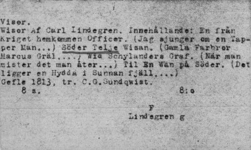 //// ^iser. //// friser Carl Lindegren. Xnnthillartöt: Ip» från iriget hemkanmen Officer. IJa^ sjunger om en Tapper lian...) ScderTeLve Wiaan. (CJwr.Ia Farbror Siarcus Grälwia Schylander» Oraf . (Kär man bister det man åter..,} Til En W&n pk Söder. (Dot ligger en Hydda i Sunnan fjäll,.*»} Gefi'« 1813, tr. C.G.oundqwrist. //// 6 s. 8;o //// " - s ." ^ ^ ' - //// Lindegren g ////