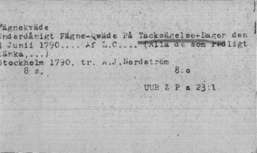 //// 'ägnekväde //// nderdårigt Fägne-^wäde På Tackaagelse-- i)a ge r der; i Juni i 1?90»,.. Af L.C. ."fÄlTä 8T WST li&t anka,...} //// Stockholm 17^0, tr. .Nord a t rom //// 8 s. 8: o //// UUB Z P a 23:1 ////