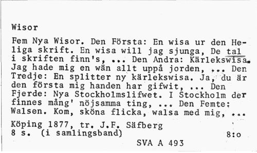 //// Wisor //// Fem Nya Wisor. Den Första: En wisa ur den Heliga skrift. En wisa will jag sjunga, De tal i skriften finn's, ... Den Andra: KärlekswTsa. Jag hade mig en wän allt uppå jorden, ... Den Tredje: En splitter ny kärlekswisa. Ja, du är den första mig handen har gifwit, ... Den Fjerde: Nya Stockholmslifwet. I Stockholm der finnes mång' nöjsamma ting, ... Den Femte: Walsen. Kom, sköna flicka, walsa med mig, ... //// Köping 1877, tr. J.F. Säfberg 8 s. (i samlingsband) 8:0 //// SVA A 49 3 //// ¦ ////