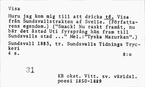 //// Visa //// Huru jag kom mig till att dricka té. Visa från Sundsvallstrakten af Svelle. (Författarens egendom.) ("Smack! Nu raskt framåt, nu bär det åstad Uti fyrsprång hän fram till Sundsvalls stad ..." Mel.:"Tyska Mazurkan".) //// Sundsvall 18S3, tr. Sundsvalls Tidnings Tryckeri //// 4 s. 8:0 //// 31 //// KB okat. Vitt. sv. världsl. poesi 1850-1889 ////