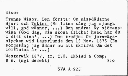 //// Wisor //// Trenne Wisor. Den första: Om missdådarne Hjert och Tektor (En liten sång jag sjunga will, god wänner, ...) Den andra: Ny sjömans-wisa (God dag, min sköna flicka! hwad har du i ditt sinn', ...) Den tredje: Om jernwägs-olyckan wid Lagerlunda den 15 Nov. 1875 (En sorgesång jag ämnar nu att skrifwa Om det förflutna år ..,) //// Westerwik 1877, tr. C.O. Ekblad & Comp» 8 s. (ngt defekt) * 8:o //// SVA A 9 925 ////