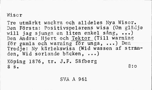 //// Wisor //// Tre utmärkt wackra och alldeles Nya Wisor. Den Första: Positivspelarens wisa (Om glädje i^ill jag sjunga en liten enkel sång, ...) Den Andra: Hjert och Tektor (Till warning för gamla och warning för unga, ...) Den Tredje: Ny kärlekswisa (Wid wassen af stranden, Wid sorlande bäcken, ...) //// Xöping 1876 , tr. J.F. Säfberg 8 s. 8:0 //// SVA A 9 61 ////