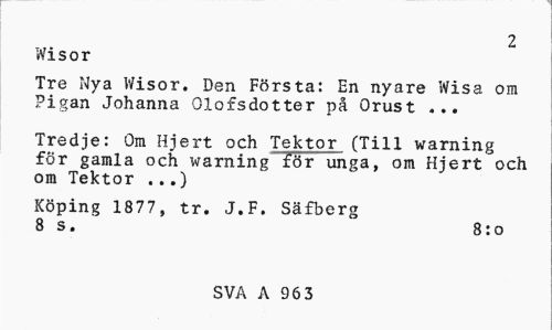 //// 2 //// Wisor //// Tre Nya Wisor. Den Första: En nyare Wisa om Pigan Johanna Olofsdotter på Orust ... //// Tredje: Om Hjert och Tektor (Till warning för gamla och warningTör unga, om Hjert och om Tektor ...) //// Köping 1877, tr. J.F. Säfberg 8 s. 8:o //// SVA A 96 3 ////