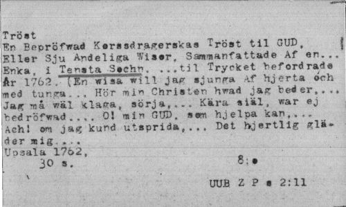 //// iTröst //// En Bepröfwad K »ra sd ragerakaa Tröat til GUD, iEller Sju Andeliga Wiaar, Sammanfattade Af en... ;Enka, i Te^ata S»chr>, ... ti 1 Trycket befordrade 'Ar 1762 . ('Än"wiaa""wi 11 ja^ ajunra Af hjerta och imed tun.?a. ., Hör nU* Christen hrad jag beder,.,. //// må wäl klaga, sörja,... Kära siäl, war ej jbed röfwad . .OJ min GUD. sam hjelpa kan,.., Achl on jas; kund utsprida,... Det bjertlig gläder !Blg. . .. Uosala 1762, //// 30 s. 8;. • //// UUB Z P a 2:11 //// ! ¦ ////