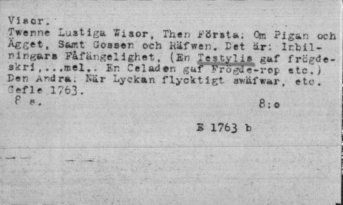 //// V5»or. //// Twenne Lustiga »Tisor, Then Eörsta; Om Pigan och Ägget, Samt Gossen och Kafwen. Let är: Icbil-ningår» Fåfängelighet, (En Tcs.tylj.» gaf frcgde-skri , .. .mel.. En Celadon gufrro ga e «•rop etc.) Den Andra. Kär Lyckan flyektigt a*/åfvar, etc. 3 efle 1763. F 6. 8 ; o //// B 1763 h ////