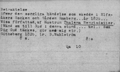 //// Betraktelse //// öTwer den sorgliga händelse son skedde i Elfs-åkers Socken och Gården Ramberg...år 1826... Wisa författad, af Hustrun Thalena Bengtsdotter. {Wänd om till 3ud i denna stund,... mel.; Son Dig Gud täckes, gör meé mig etc.) Götheberg 1826, tr. 3.Wahlström //// 6 a. 8: o //// w> 10 ////