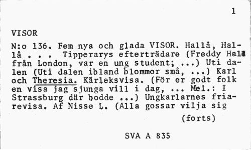 //// 1 //// VISOR //// N:o 136. Fem nya och glada VISOR. Hallå, Hallå . . . Tipperarys efterträdare (Freddy Hall från London, var en ung student; ...) Uti dalen (Uti dalen ibland blommor små, ...) Karl och Theresia. Kärleksvisa. (För er godt folk en visa jag sjunga vill i dag, ... Mel.: I Strassburg där bodde ...) Ungkarlarnes fria-revisa. Af Nisse L. (Alla gossar vilja sig //// (forts) //// SVA A 96 3 ////