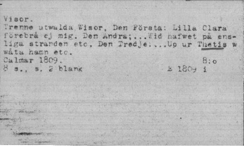 //// Vi ser. //// T re nr» atwuida Wisor, Den Första: Lilla Clara förebrå ej mig. Den Andra;nafwet pä ensliga stranden etc. Den Tredje. ., .Up ur Thetig w wåtu hacsn etc. //// Caltnar 18C9 . 8:0 //// 8 a., s, 2 blank ¦ is. l80-/ i ////